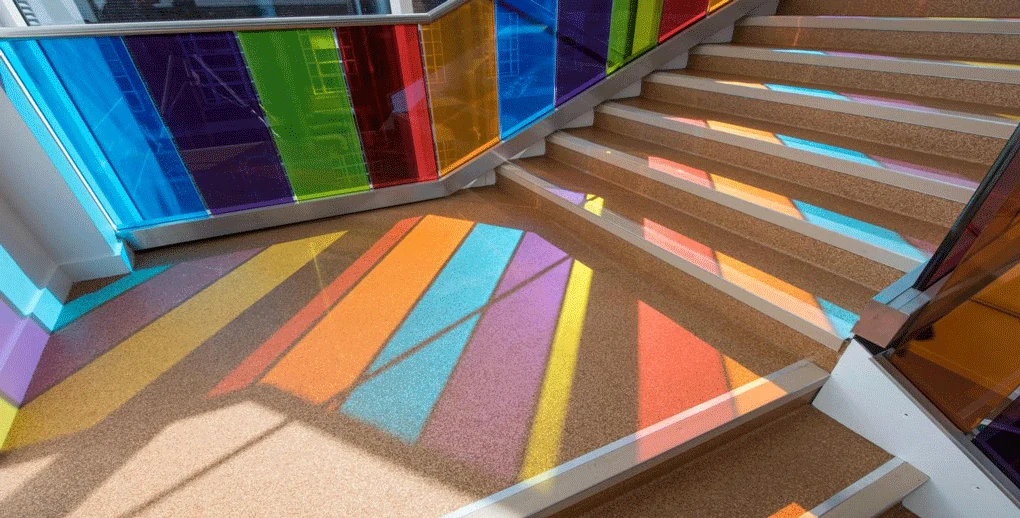 The inks used in digital printing on glass mimic the CMYK color model and are made of ceramic frit and inorganic pigments and elements. The development of inks is a highly controlled production process to remove any variability in the final product. The consistency in replication of the inks results in high compatibility with the entire color palette of inks. The inks can therefore be digitally mixed and designers will know the precise outcome of the color every time. Printed glass panels can also be replaced when necessary without the risk of the new panels not matching the colors of the existing panels. The inks are also fully integrated with the machine and the image processing software meaning the development and the application of the inks required innovations both in science and technology.